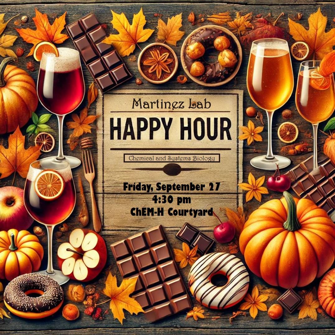 Join us! The Martinez Lab will be hosting their lab happy hour today, Friday – September 27 starting at 4:30pm on ChEM-H Courtyard!